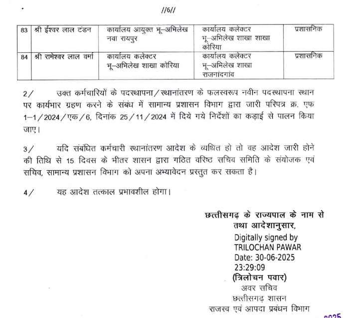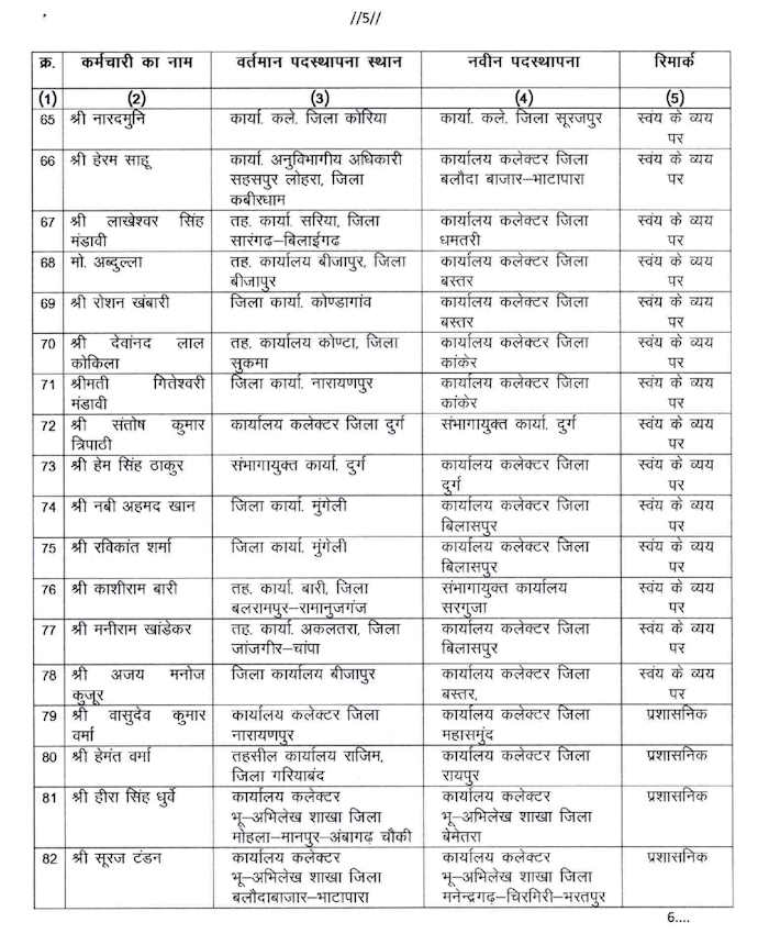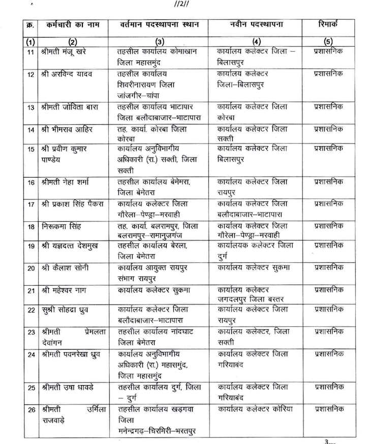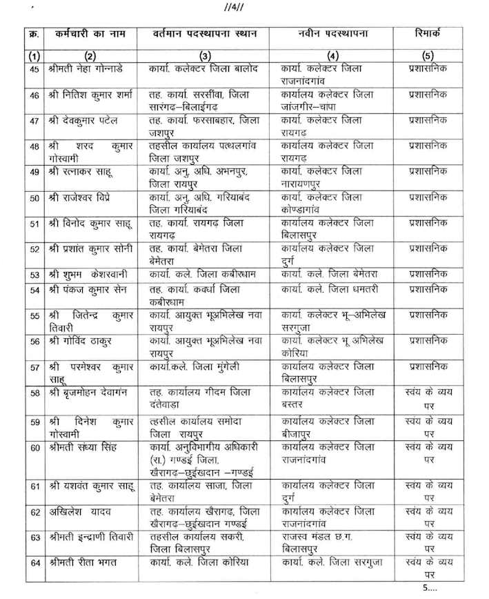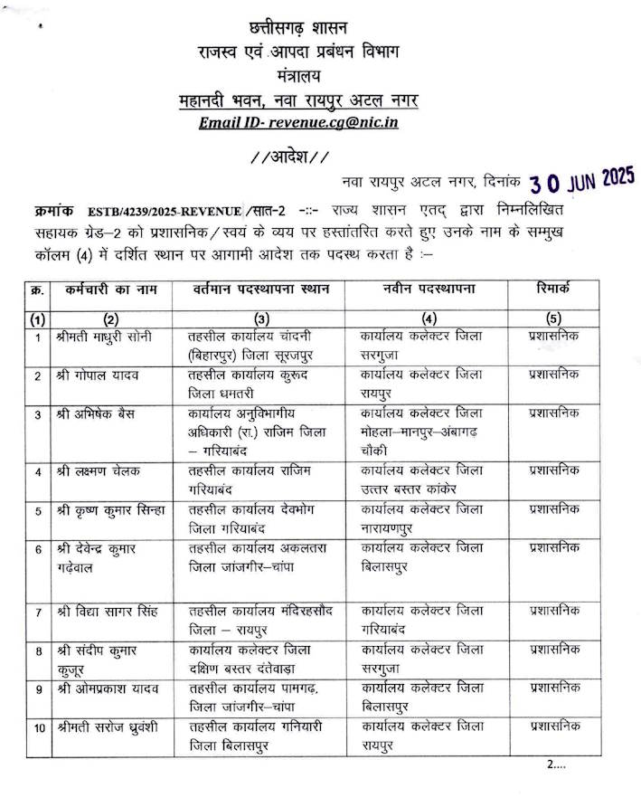 छत्तीसगढ़ सरकार ने राजस्व एवं आपदा प्रबंधन विभाग में बड़ी संख्या में किये तबादले , देखे आदेश की सूची