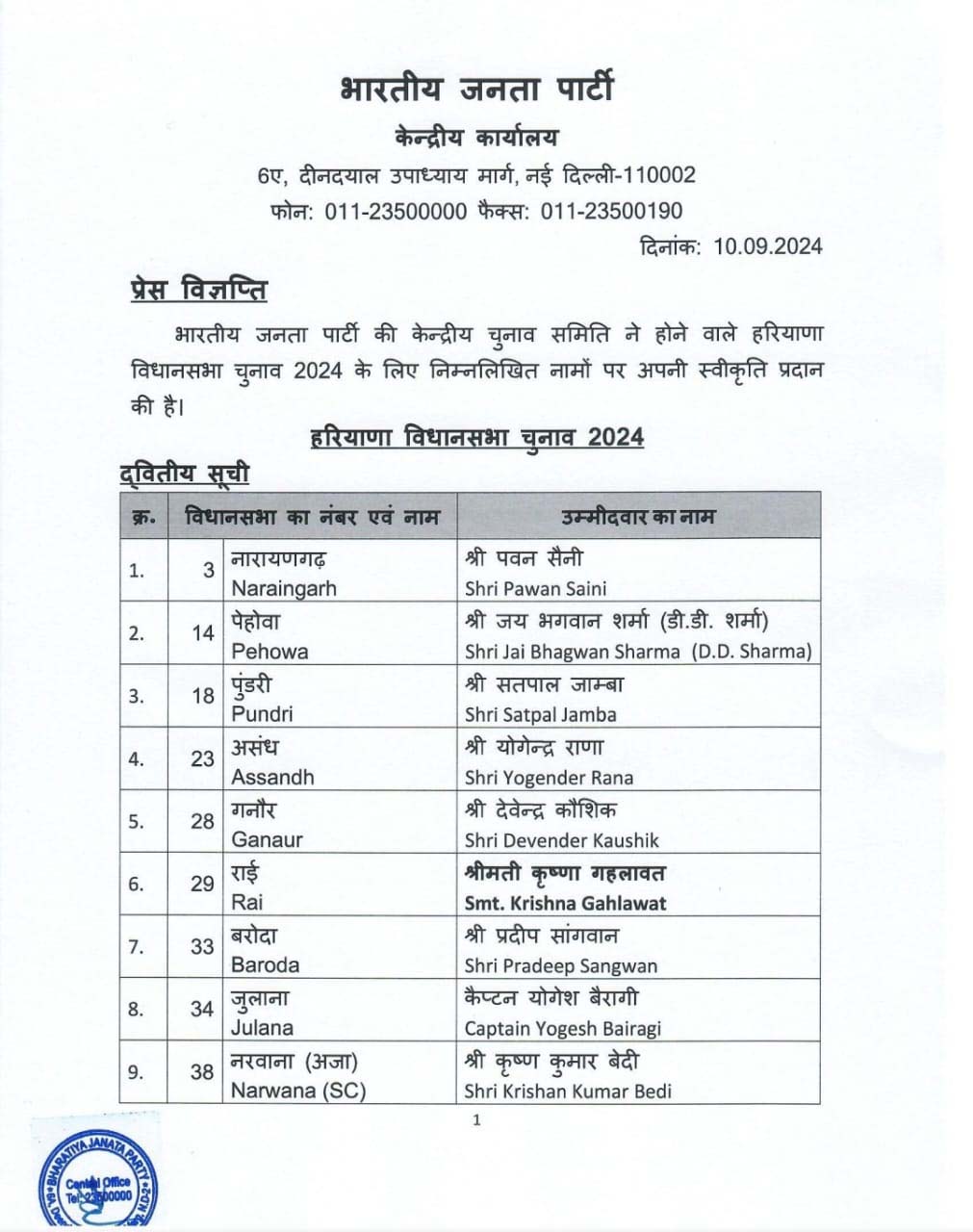 नई दिल्ली । भारतीय जनता पार्टी(भाजपा) ने हरियाणा विधानसभा चुनाव के लिए 21 उम्मीदवारों की दूसरी सूची जारी की। इस सूची में नरवाना विधानसभा से कृष्ण कुमार बेदी, राई से कृष्णा गहलावत, पुंडरी से सतपाल जाम्बा, नूंह से संजय सिंह, फिरोजपुर झिरका से नसीम अहमद, नारनौल से ओम प्रकाश यादव को उम्मीदवार बनाया गया है। इस सूची में भाजपा ने दो मंत्रियों का टिकट काटा है। इसमें बावल सीट से बनवारी लाल और बड़खल से शिक्षा मंत्री रहीं सीमा त्रिखा शामिल हैं।