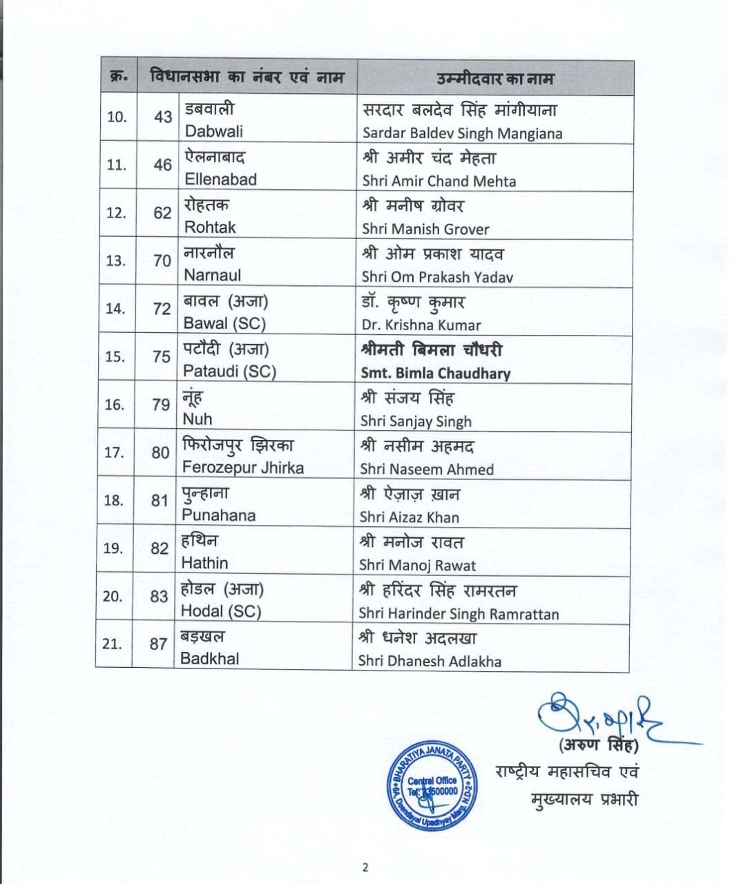 वहीं, भाजपा ने इस सूची में दो महिलाओं को भी टिकट दिया है। इसमें राई से कृष्णा गहलावत औऱ गुरुग्राम की पटौदी से बिमला चौधरी को टिकट दिया गया है।