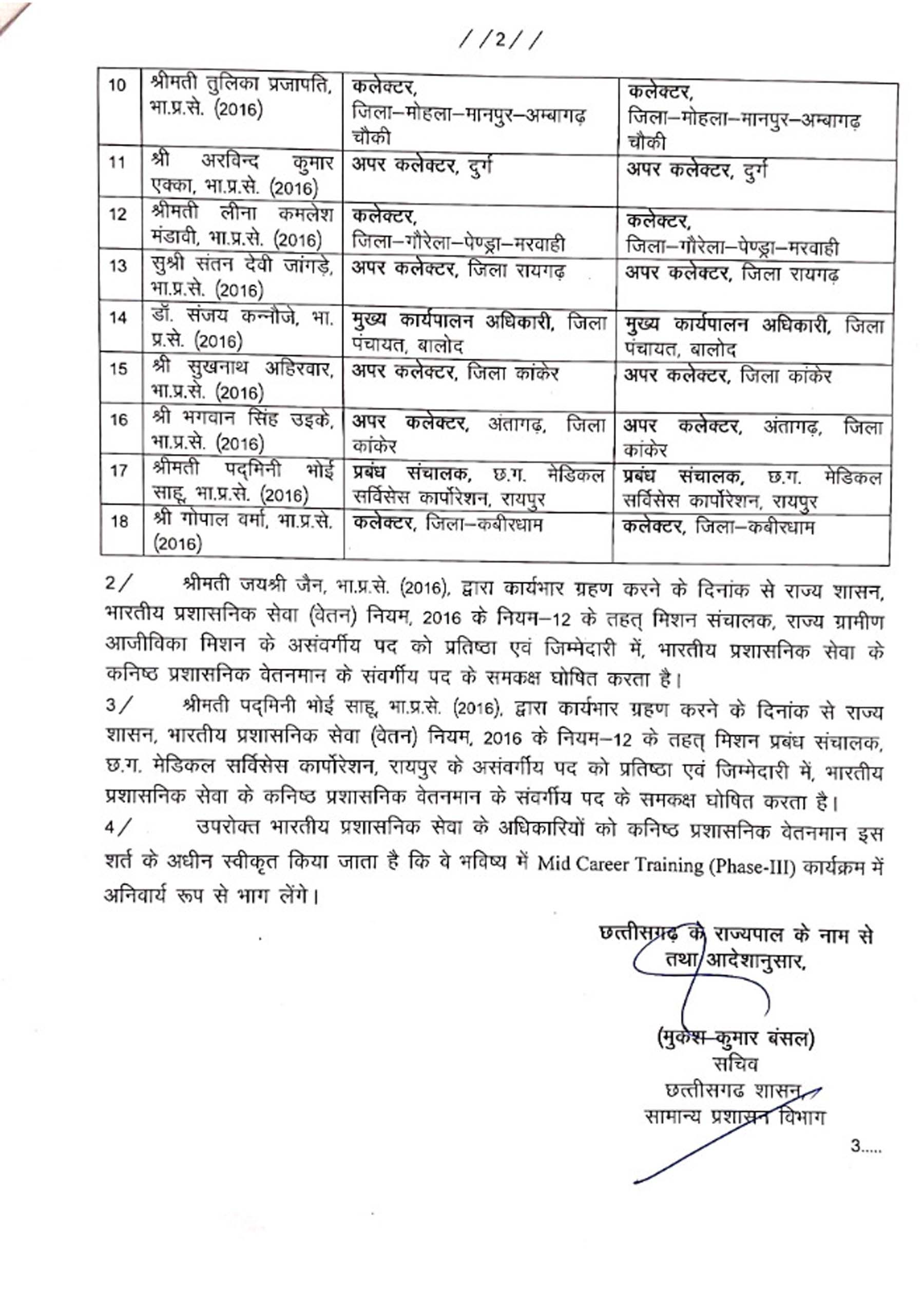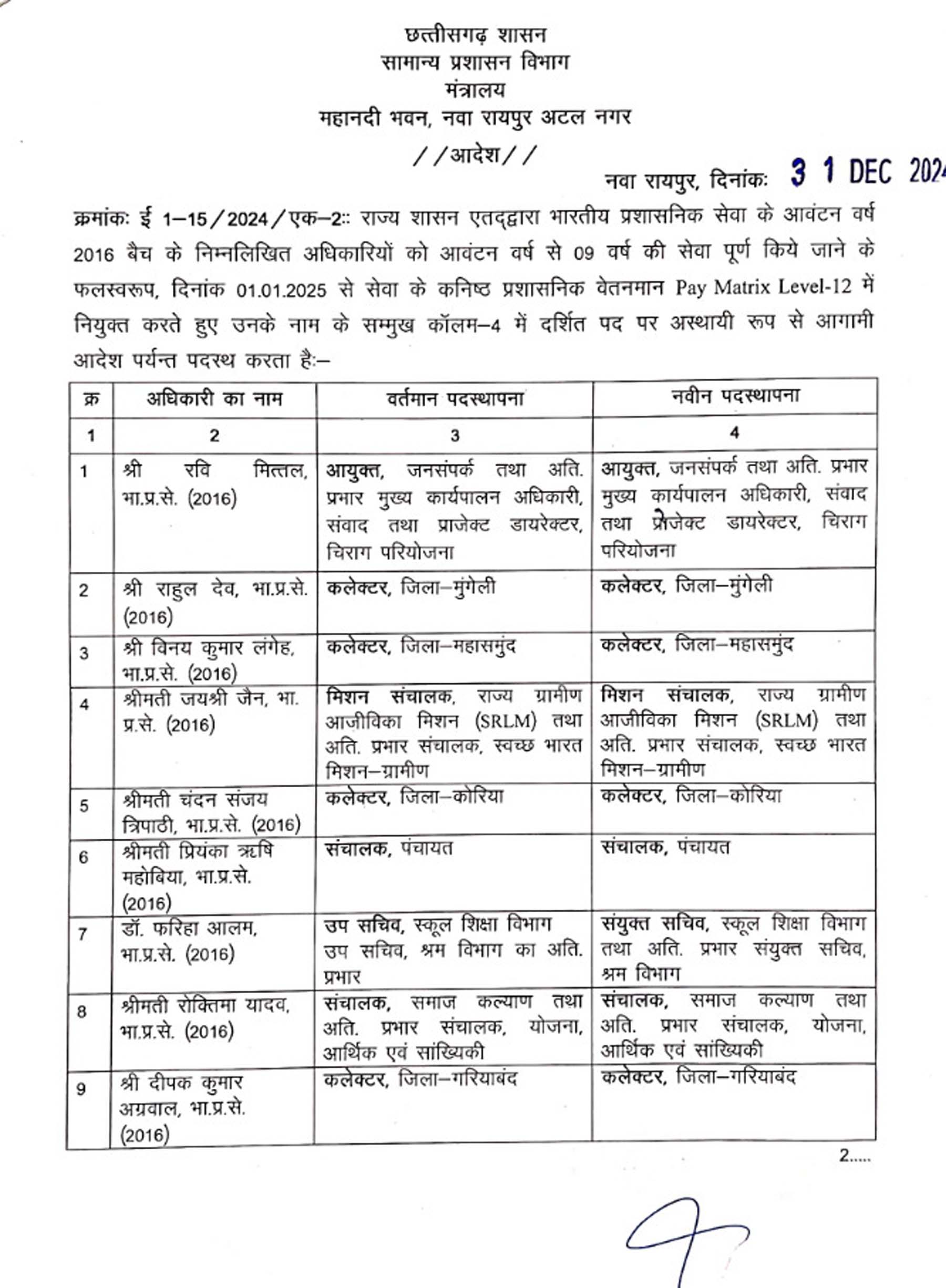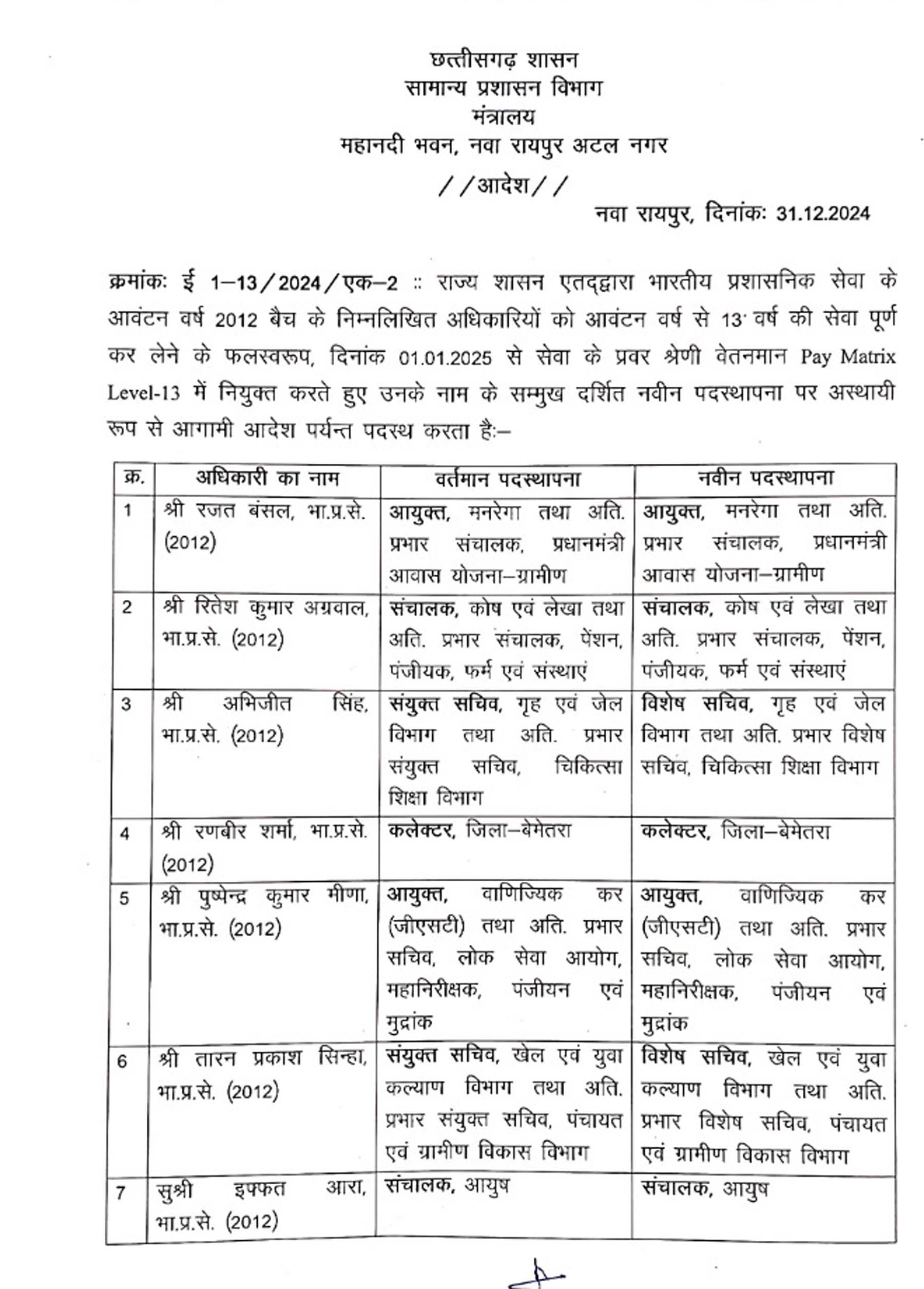 रायपुर। साल 2024 के आखिरी दिन प्रदेश के 30 आईएएस अफसरों को प्रमोशन मिला है। 2012 बैच के 10 अफसरों को जहां सेलेक्शन ग्रेड दिया गया है। वहीं जनसंपर्क आयुक्त रवि मित्तल सहित 18 अफसरों को कनिष्ठ प्रशासनिक वेतनमान दिया गया है। वहीं 2021 बैच के दो अफसरों को वरिष्ठ वेतनमान मिला है।