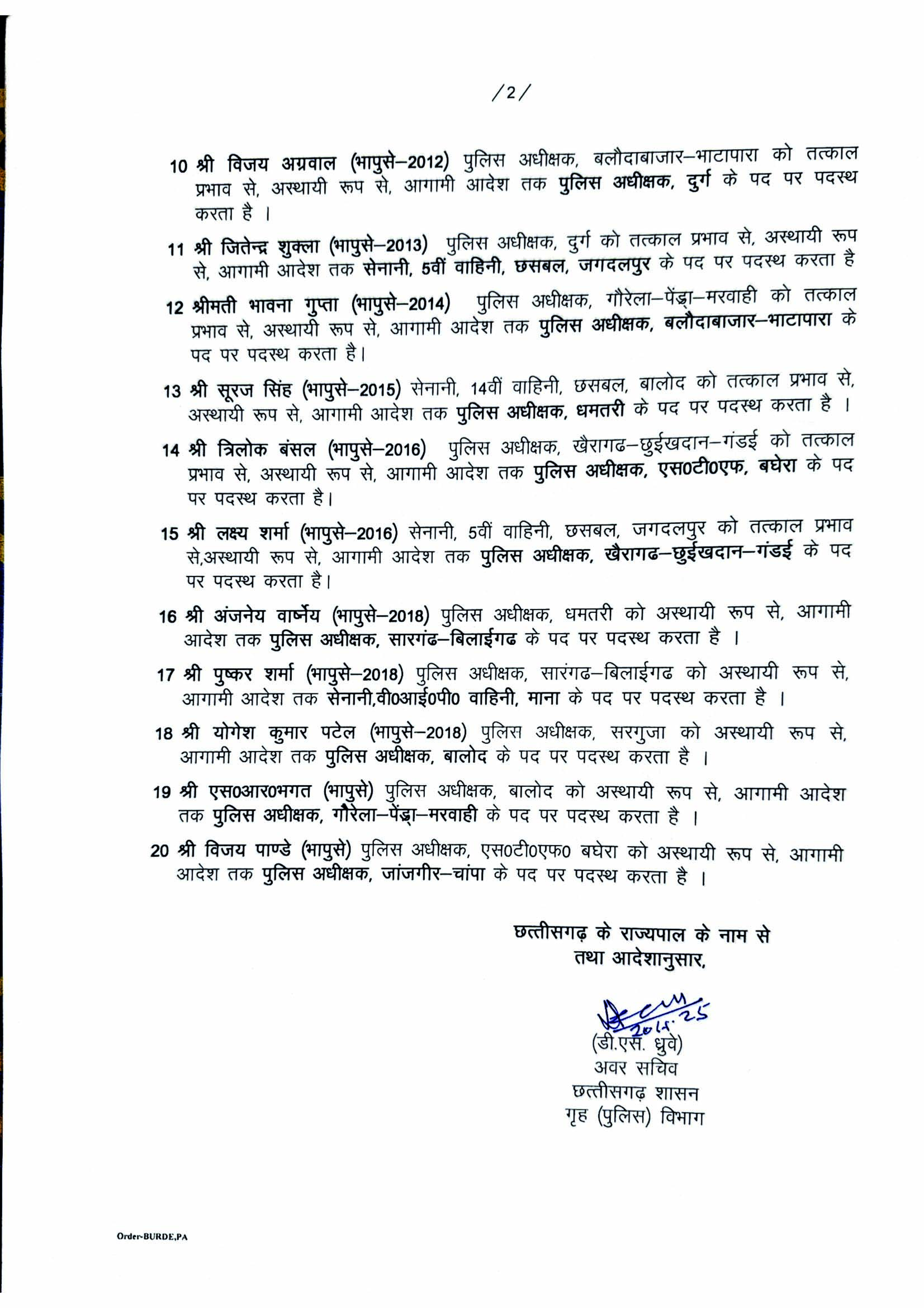 रायपुर। छत्तीसगढ़ सरकार ने आईएएस अधिकारियों के बाद आज फिर आईपीएस अधिकारियों का  ट्रांसफर कर दिया है। रविवार काे जारी सूची में 20 अधिकारियों की लिस्ट जारी की गई है जिनमें कुछ जिलों के एसपी भी बदल दिए गए हैं।